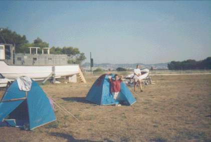 Pleine vue sur la tente des chefs mais aussi sur la piste de décollage mitoyenne avec notre lieu de camp. Le bateau à moitié repeint appartient aux scouts d'Hyères qui nous ont gentiment prêté le terrain.